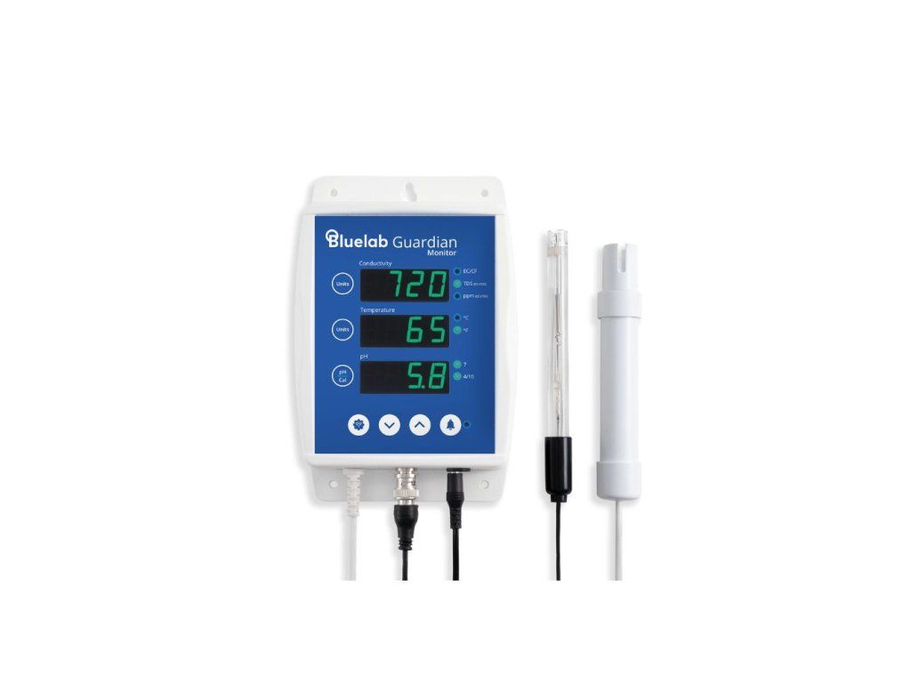 měřící přístroj pro zkušené pěstitele zajistí přesné měření a sledování pH, teploty a elektrické vodivosti pomocí dvou sond a velkého monitoru. Bluelab Guardian Monitor byl navržen pro použití uvnitř, a proto jej lze jednoduše připevnit nebo zavěsit nejen na stěnu. Obě sondy jsou připevněny na dvoumetrových kabelech.