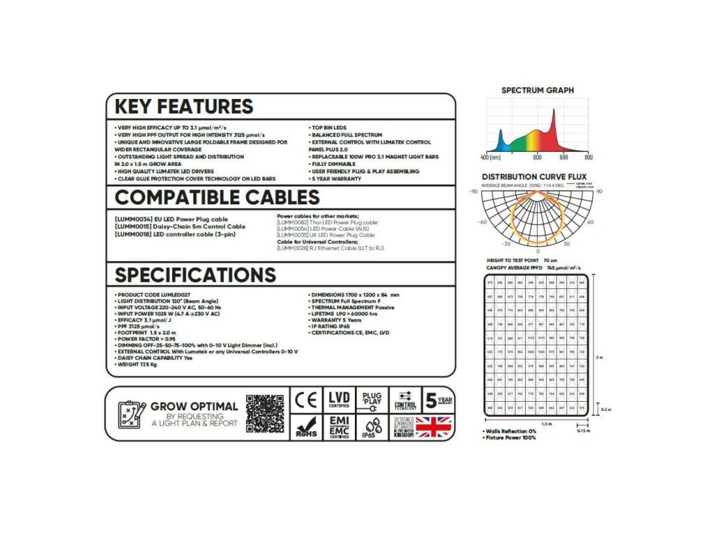 Zařízení ZEUS 1000W PRO EVO 3.1, které poskytuje největší obdélníkovou plochu pokrytí z jediného největšího lineárního tyčového uspořádání na trhu, je navrženo tak, aby vytvářelo nejlepší distribuci světla v plném spektru pro velkoplošné pěstování. Vyšší specifikace nového LED svítidla LUMATEK ZEUS 1000W PRO EVO 3.1 je lineární vícesvětelné tyčové svítidlo s produkcí extrémně vysoké úrovně PPF 3125 μmol/s a účinnosti 3,1 μmol/J.