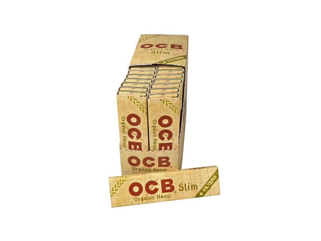 Cigaretové papírky OCB Slim Organic +Filters. Papírky jsou vyrobené z ultratenkého konopného papíru. Knížečka obsahuje 32 papírků + 32 filtrů. Rozměry papírku: 44x109 mm. V boxu 32 ks.