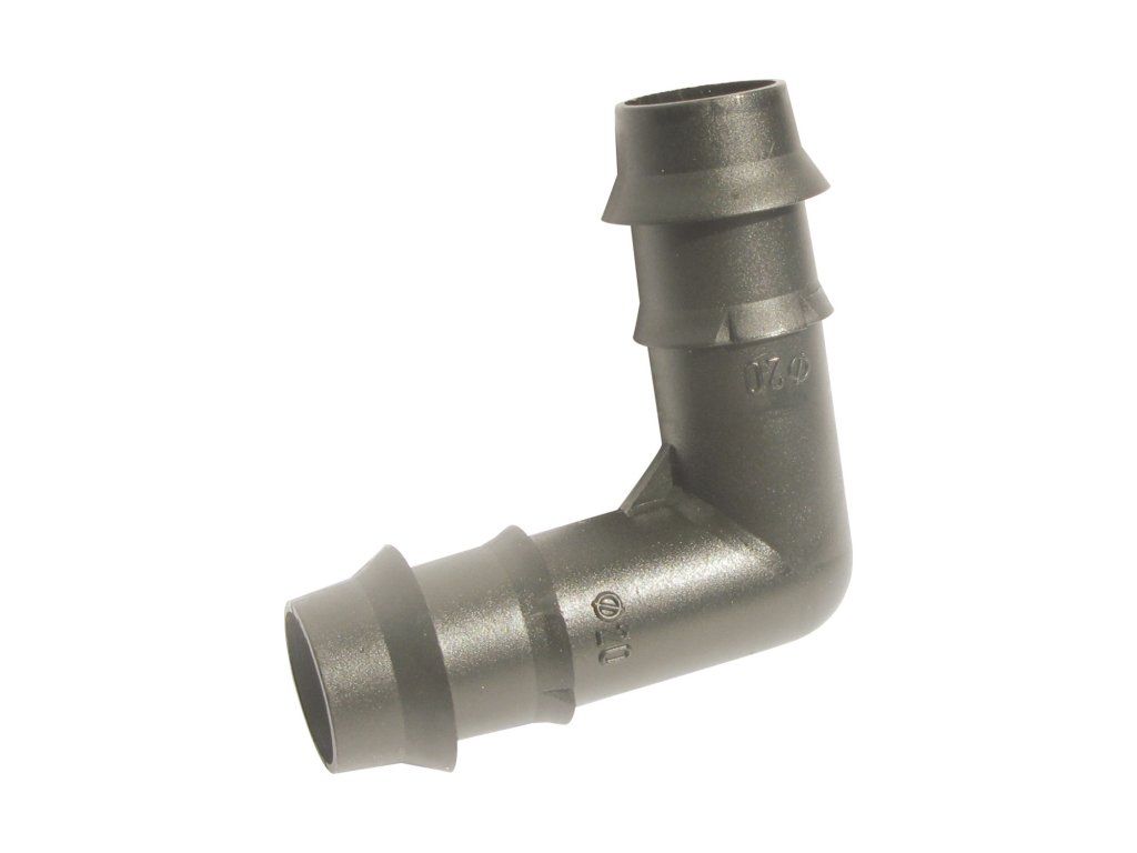 Plastové koleno, L spoj, do závlahy. Průměr 16 mm.