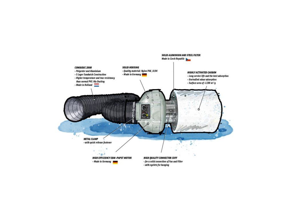 Kompletní ventilační set Prima Klima PK125-TC zahrnuje výkonný ventilátor s regulací otáček dle teploty, účinný pachový filtr s aktivním uhlím, odolné 3m ventilační potrubí, stahovací sponu a spojovací manžetu.