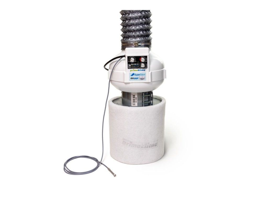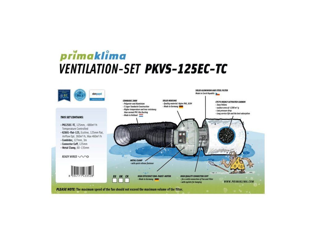 Kompletní ventilační set Prima Klima PK125EC-TC zahrnuje výkonný ventilátor s regulací otáček dle teploty a EC motorem, účinný pachový filtr s aktivním uhlím, odolné 3m ventilační potrubí, stahovací sponu a spojovací manžetu.