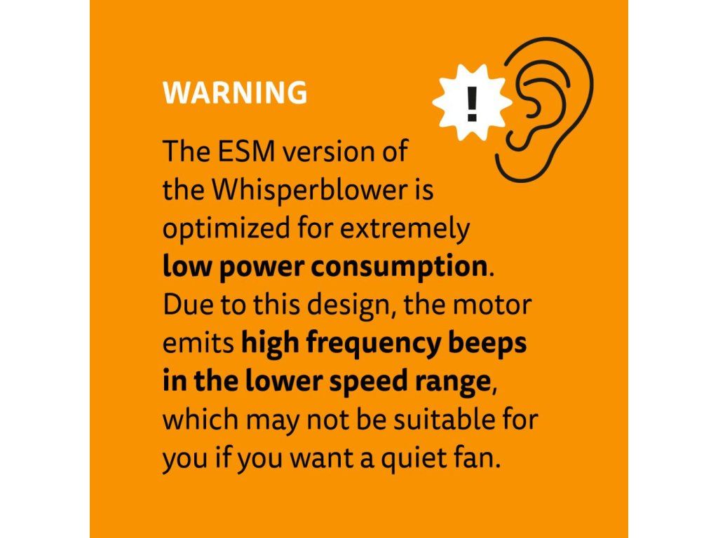 Pozor, ventilátor není optimalizován pro co nejnižší hlučnost, ale spotřebu! Při nižších otáčkách vydává vysokofrekvenční zvuk a proto není vhodný pro uživatele vyžadující maximálně tichý chod ventilace.