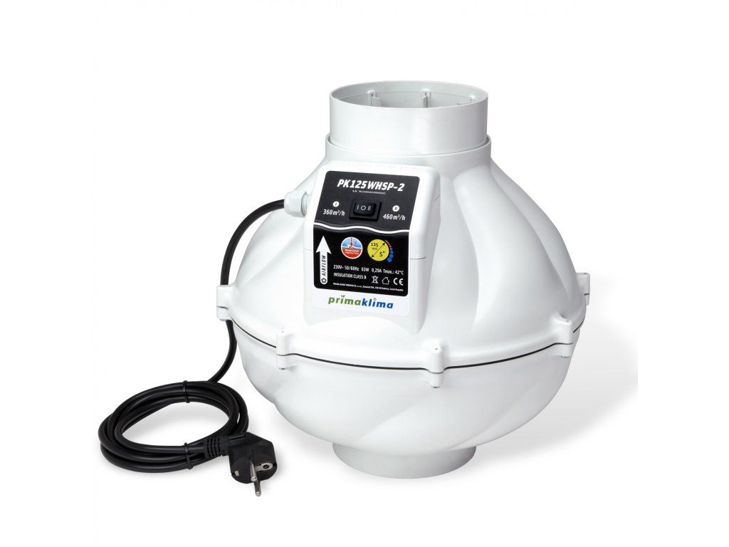Nový dvourychlostní odhlučněný ventilátor Prima Klima Silenced Whisperblower s maximálním průtokem vzduchu 460 m3/h. Průměr 125 mm.