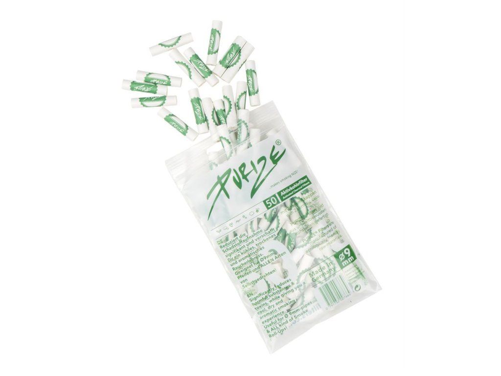 Purize Regular 9mm filtry bílé, PE sáček 50 ks. Filtry PURIZE s aktivním uhlím jsou vyrobeny z ekologicky šetrných surovin. Cigaretové filtry aktivně snižují množství škodlivin vzniklých hořením.
