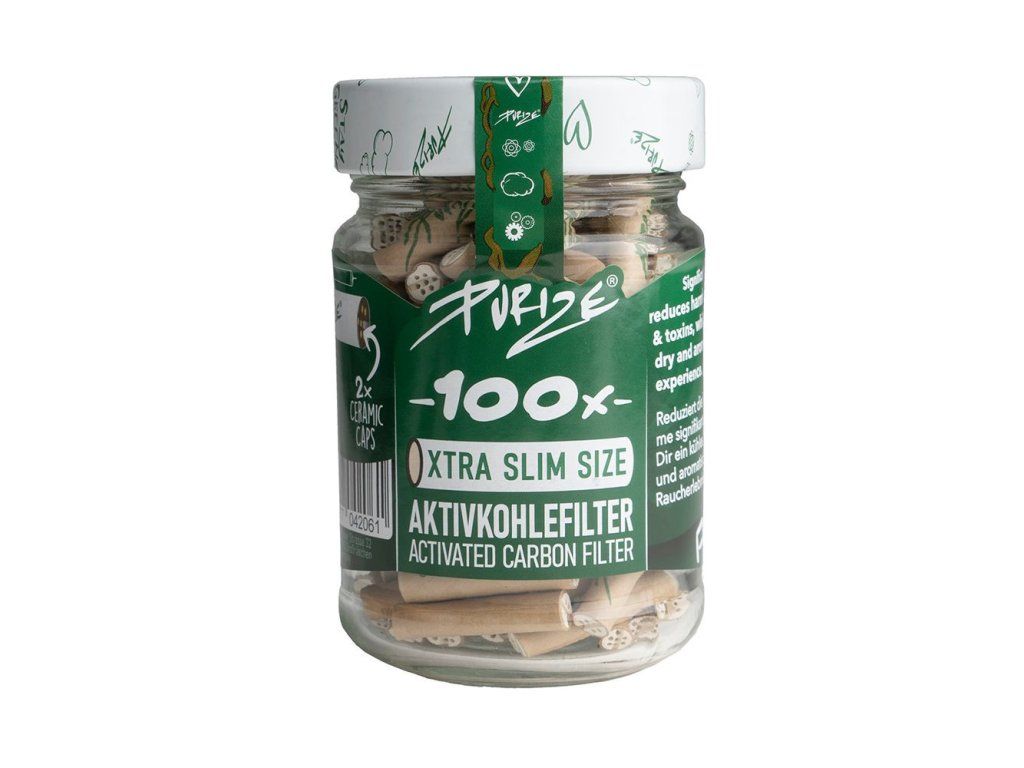 Purize XTRA Slim 5.9mm filtry Organic, sklenice 100 ks. Filtry PURIZE s aktivním uhlím jsou vyrobeny z ekologicky šetrných surovin. Cigaretové filtry aktivně snižují množství škodlivin vzniklých hořením.