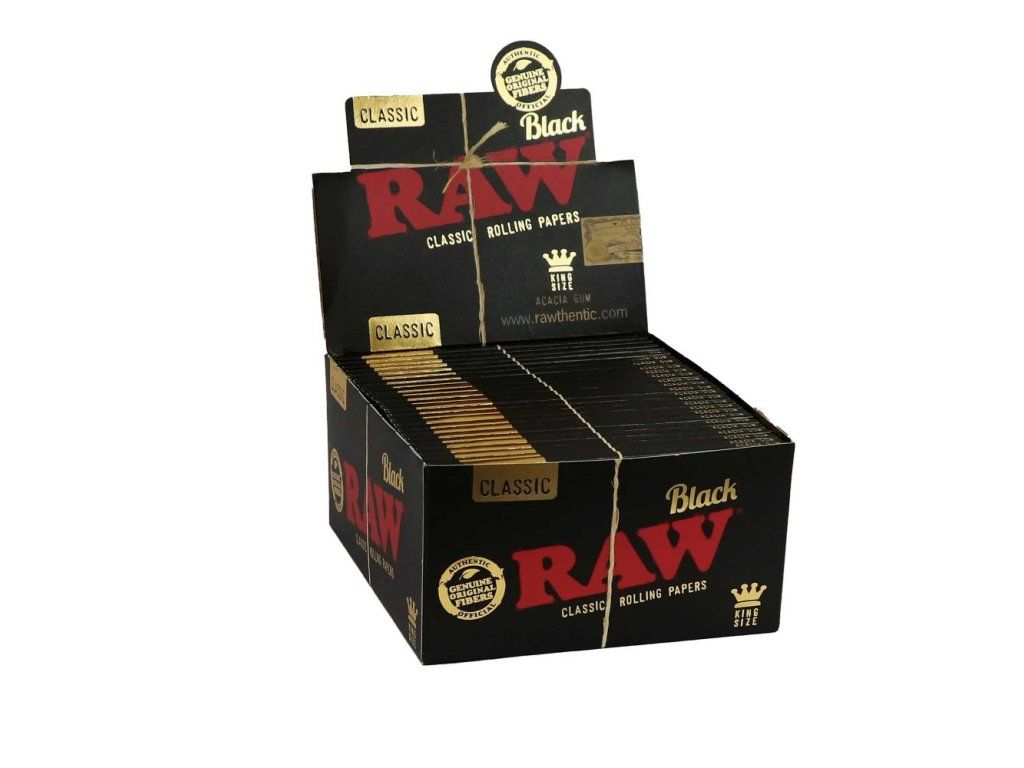 Jedno balení RAW Black King Size obsahuje 33 nebělených, pomalu hořících papírků Ve zvýhodněném boxu najdete 50 balení.