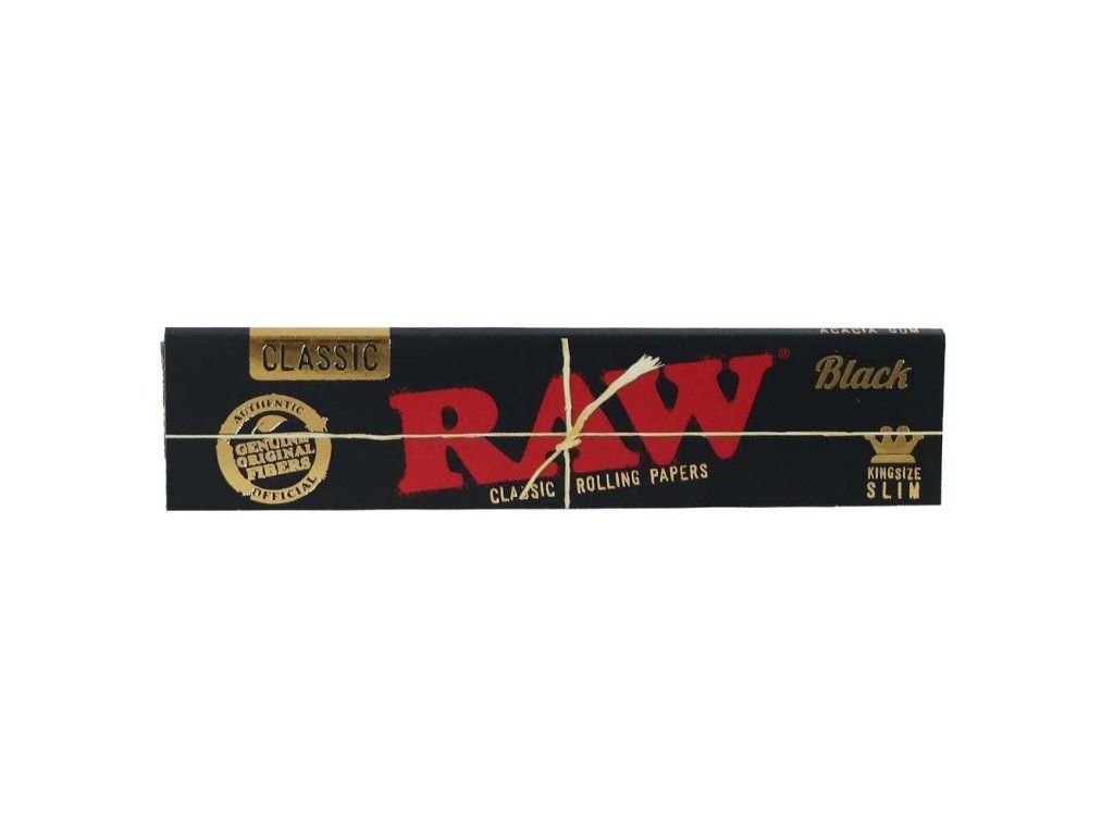 Přírodní dlouhé papírky RAW. Jedno balení RAW Black King Size Slim obsahuje 32 nebělených, tenkých a pomalu hořících papírků.