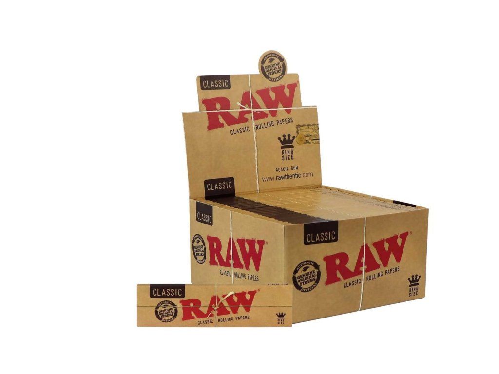 Přírodní dlouhé papírky RAW. Jedno balení RAW King Size obsahuje 33 nebělených, pomalu hořících papírků Ve zvýhodněném boxu najdete 50 balení.