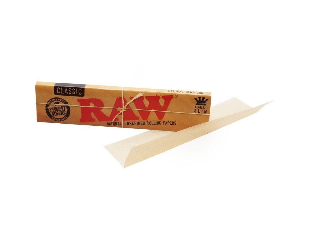 Přírodní dlouhé papírky RAW. Jedno balení RAW King Size Slim obsahuje 32 nebělených, tenkých a pomalu hořících papírků.