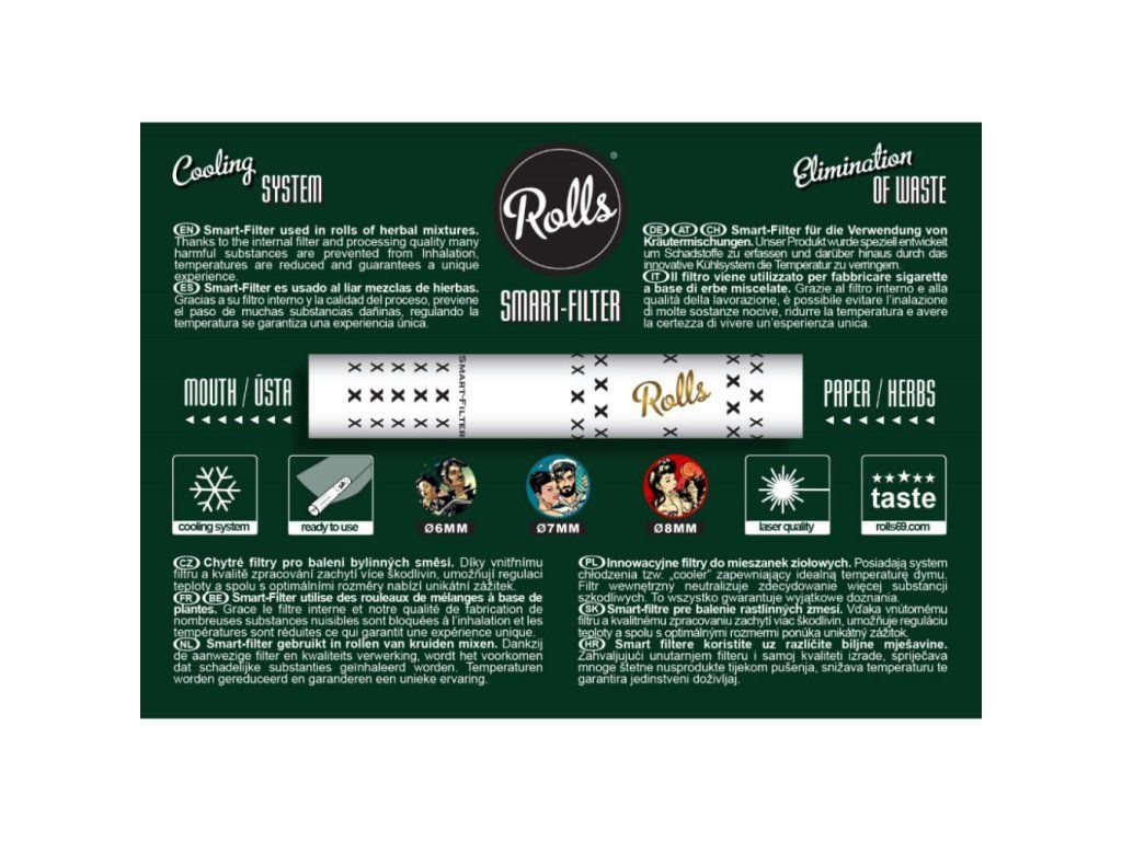 Chytré filtry Rolls® jsou speciálně navrženy tak, aby zabránili škrábání v krku, kašli, vdechování horkého kouře a škodlivých látek.