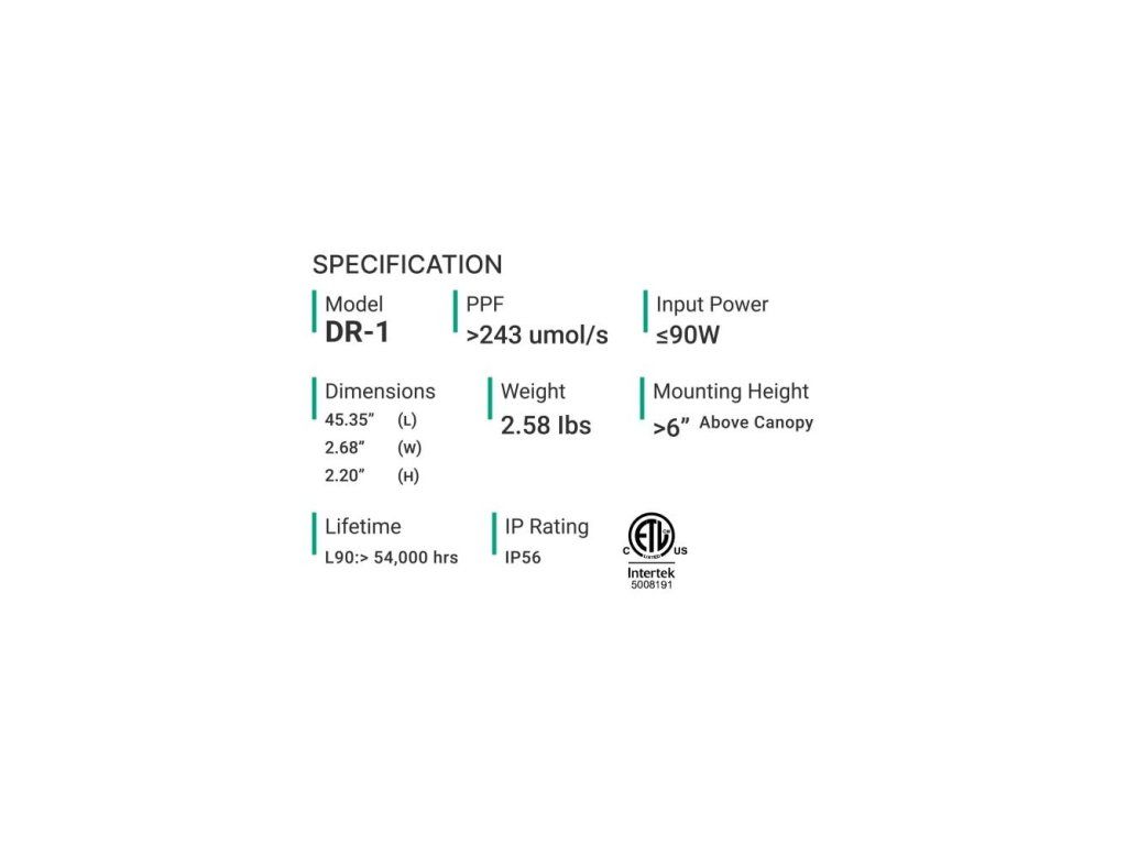 4' LED lišta s 2x spektrálními kanály (plné spektrum + deep red) pro systém Thinkgrow Model One, DR-1, je standardní 4' LED světelná lišta, která je vybavena kanály plného spektra a sytě červeného spektra. Lze ji připojit k řídicí jednotce TrolMaster, což pěstitelům umožňuje vybrat si z řady receptů spektra pro různé plodiny a růstové fáze. Této flexibility lze dosáhnout pomocí vestavěného stmívacího knoflíku nebo kompatibilních regulátorů. Obsah balení: 1x 4' LED lišta s 2x spektrálními kanály (plné spektrum + sytě červená) pro systém Model One. Specifikace: V balení naleznete všechny potřebné informace o spektru: PPF: > 243 μmol/J. Příkon: 90 W. Montážní výška: 1,5 m: > 6“ (15,2 cm) nad canopy. Životnost: L90: > 54 000 hodin. Rozměry: 1152x68x56 mm.