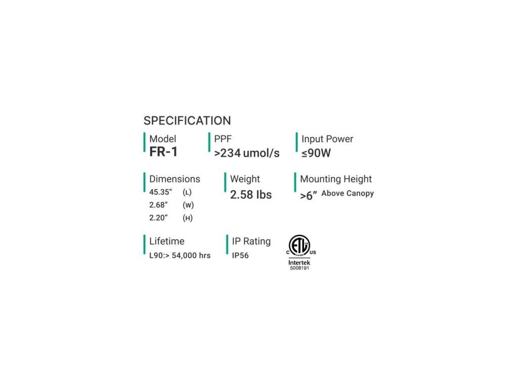 4' LED lišta s 2x spektrálními kanály (plné spektrum + far red) pro systém Thinkgrow Model One LED, FR-1, je standardní 4' LED světelná lišta, která obsahuje dva spektrální kanály, plné spektrum a vzdálenou červenou. Po připojení k řídicí jednotce TrolMaster účinně pokrývá základní fáze růstu od vegetace po kvetení. Poskytnutím cíleného dalekého červeného světla plodině v určitou dobu můžete manipulovat s reakcemi rostlin, urychlit kvetení a zvýšit celkový výnos. Obsah balení: 1x 4' LED lišta s 2x spektrálními kanály (plné spektrum + daleká červená) pro systém LED Model One. Specifikace: V balení naleznete všechny potřebné informace o spektrálním spektru: PPF: > 243 μmol/J. Příkon: 90 W. Montážní výška: 1,5 m: > 6“ (15,2 cm) nad canopy. Životnost: L90: > 54 000 hodin. Rozměry: 1152x68x56 mm.