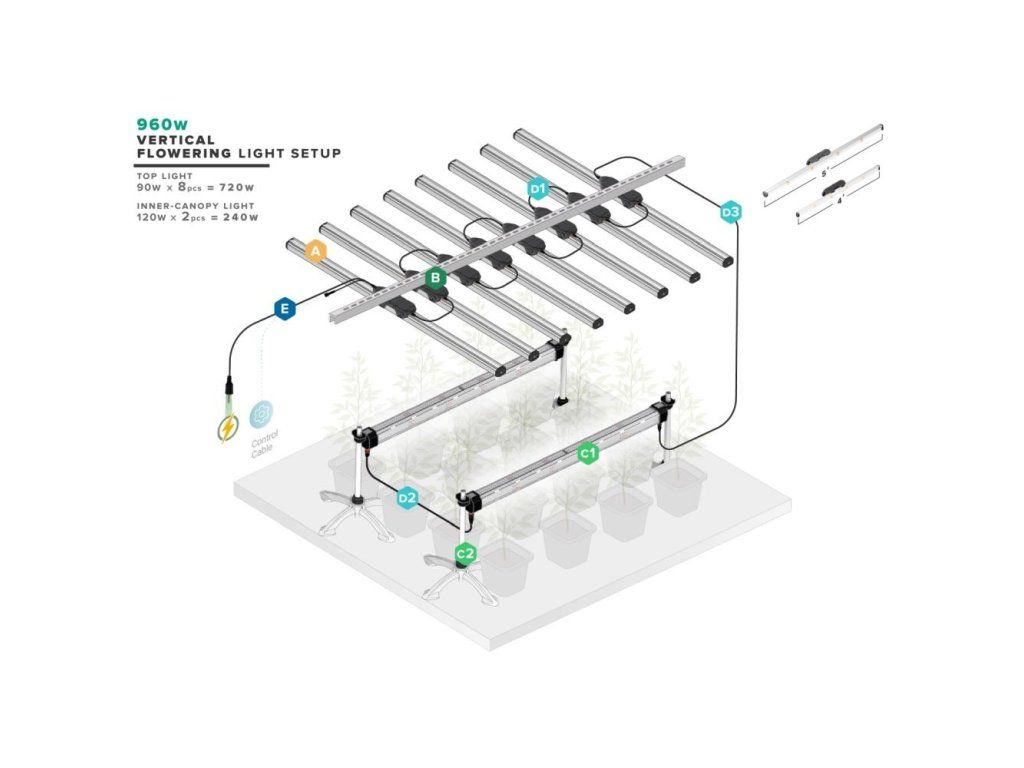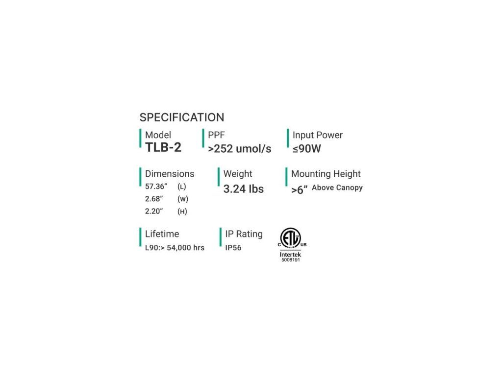 5' LED lišta se 4 spektrálními kanály (bílá + deep red + far red + UV) pro systém Thinkgrow Model One LED, TLB-2, je pokročilá 5' LED světelná lišta, která je vybavena čtyřmi spektrálními kanály, včetně plného spektra, sytě červené, dálkově červené a UV. Po připojení k řídicí jednotce TrolMaster dokáže TLB-2 napodobit vlastnosti přirozeného slunečního světla tím, že uživateli umožňuje nastavit skutečné světelné spektrum. To umožňuje pěstitelům přizpůsobit požadovaný světelný recept pro jejich rostliny s využitím čtyř samostatně ovladatelných kanálů spektra. Každý TLB-1 poskytuje 90 wattů světla. Obsah balení: 1x 5' LED lišta se 4 spektrálními kanály (bílá+ sytě červená+ dálkově červená+ UV) pro systém LED Model One. Specifikace: 1. Vnitřní osvětlení, 2. Vnitřní osvětlení, 3. Vnitřní osvětlení, 4: PPF: > 252 μmol/J. Příkon: 90 wattů. Montážní výška: 1,5 m: > 6“ (15,2 cm) nad canopy. Životnost: L90: > 54 000 hodin. Rozměry: 1457x68x56 mm.