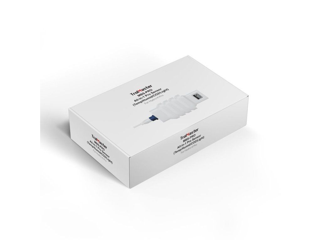 Senzor MBS-PRO 4 v 1 kombinuje přesný senzor teploty vzduchu, vlhkosti, CO2 (PPM) a fotobuňku, a vytváří tak dokonalý univerzální senzor prostředí. Je určen pro systémy Hydro-X Pro i Hydro-X Plus.
