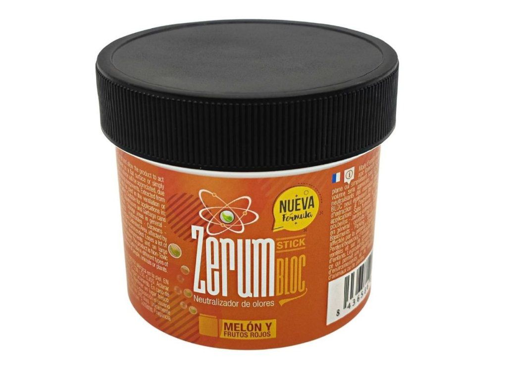 Univerzální, netoxický a účinný neutralizér zápachu Zerum BLOC Stick Meloun & Lesní plody, 170 g je pevný odstraňovač nepříjemných pachů. K dostání v balení 170 nebo 720 g a 4 vůních: lesní jahoda (Fresa silvestre), meloun a červené ovoce (Melón y frutos rojos), máta (Mentolado), neutrální (Neutro).